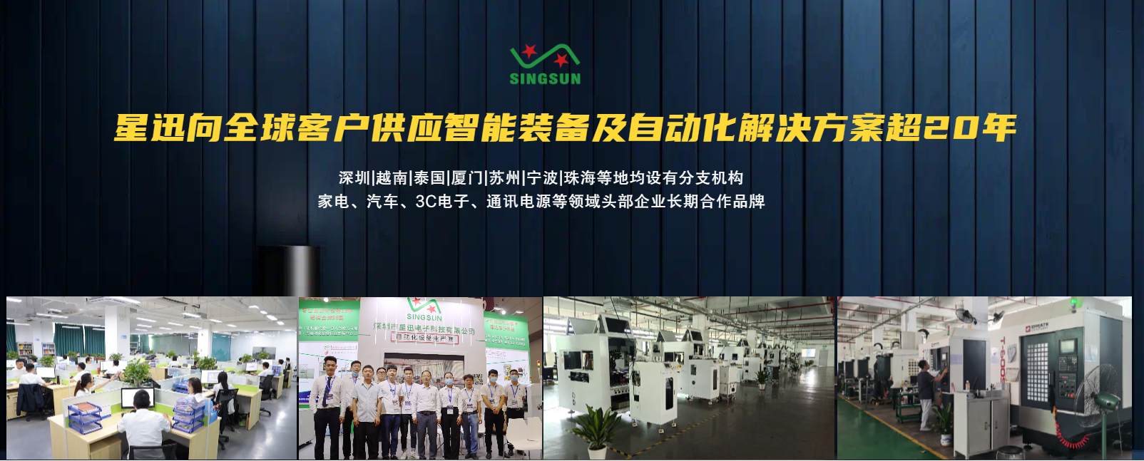 子公司江西星迅科技成立于2021年,位于江西省吉安市吉州區(qū)華耀科技產(chǎn)業(yè)園,江西吉安廠(chǎng)區(qū)面積約13000㎡,在建星迅智能裝備工業(yè)園占地50畝??偛课挥谏钲趯毎哺:=值阑浉郯拇鬄硡^(qū)智能制造基地,占地面積15000㎡。為智能制造領(lǐng)域客戶(hù)提供“一站式、立體化”的自動(dòng)化解決方案。公司主營(yíng)產(chǎn)品主要包括自動(dòng)化生產(chǎn)線(xiàn)、自動(dòng)鎖螺絲機(jī)、機(jī)器人及視覺(jué)、異形插件機(jī)、電子元件成型機(jī)、分板機(jī)等先進(jìn)裝備,廣泛應(yīng)用于3C電子、家電、電源、汽車(chē)制造、新能源等行業(yè)。服務(wù)客戶(hù)包括比亞迪、光寶、臺(tái)達(dá)電子、美的、松下、海爾、格力、立訊、華為、中興、TCL、群光、亞榮源、海信、雅特生、長(zhǎng)虹、茂碩、拓邦、偉創(chuàng)力、康佳、賽爾康、奧克斯等全球品牌企業(yè)。